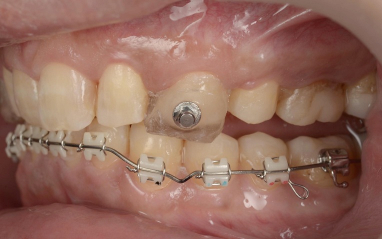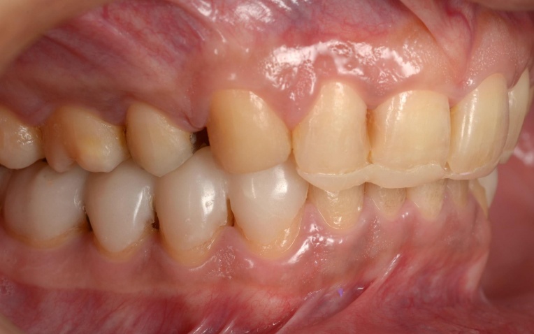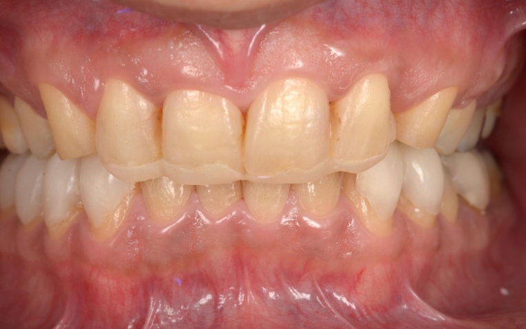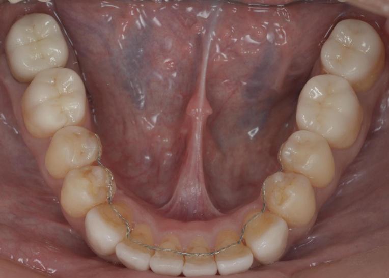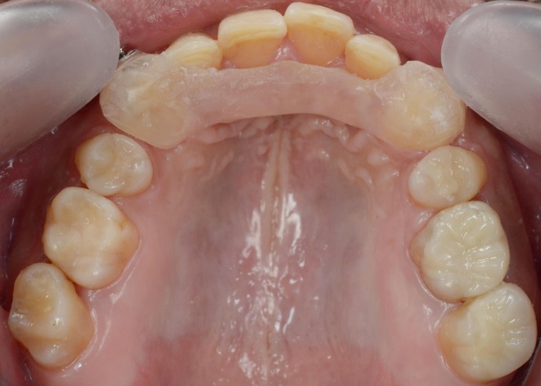 そのため、上顎前歯には上顎のスプリントを必要な部分だけカットして歯に直接接着し、噛み合わせの高さを維持するストッパーとして活用しました。